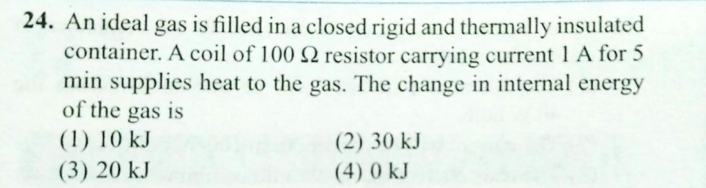 An ideal gas is filled in a closed rigid and thermally insulated container. A coil of 1000 ohm resistor carrying current 1 A for 5 min supplies heat to the gas . The change in internal energy of the gas is The operating temperature of the filament of lamp is 2000∘C. The temperature coefficient of the material of the filament is 0.005∘C−1. If the atmospheric temperature is 0∘C then the current in the 100 W−200 V lamp when it is switched on is nearest to November 17, 2020 Category: Uncategorised (JEE Advanced Physics by BM Sharma + GMP Solutions) , Facebook Messenger WhatsApp Share this:TwitterFacebook Related