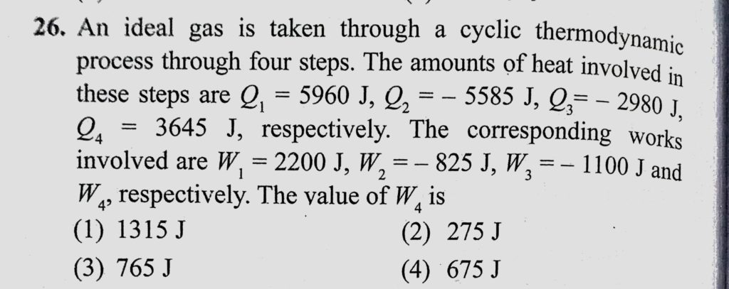 An ideal gas is taken through a cyclic thermodynamic process through four steps. The amounts of heat involved in these steps are Q1 = 5960 J, Q2 = – 5585 J, Q3 = – 2980 J. An ideal gas is taken through a cyclic thermodynamic process through four steps. The amounts of heat involved in these steps are Q1 = 5960 J Q2 = -5585 J Q3 = - 2980 J. October 29, 2020 Category: Uncategorised (JEE Advanced Physics by BM Sharma + GMP Solutions) , Facebook Messenger WhatsApp Share this:TwitterFacebook Related