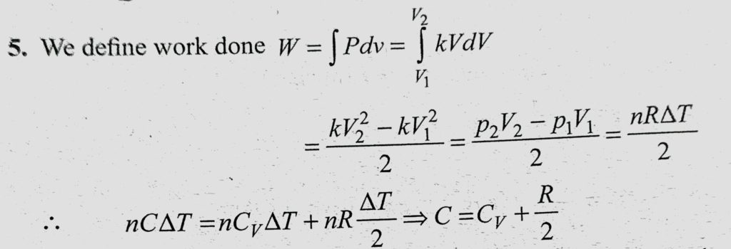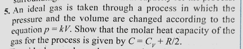 An ideal gas is taken through a process in which the pressure and the volume are changed according to the equation p = kV. Show that the molar heat capacity of the gas for the process An ideal gas is taken through a process in which the pressure and the volume are changed according to the equation p = kV. Show that the molar heat capacity of the gas for the process October 28, 2020 Category: Uncategorised (JEE Advanced Physics by BM Sharma + GMP Solutions) , Facebook Messenger WhatsApp Share this:TwitterFacebook Related