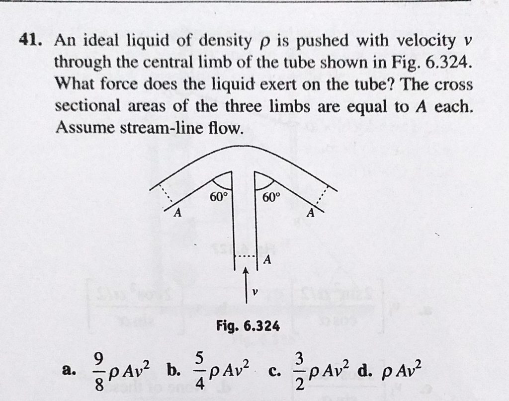 An ideal liquid of density rho is pushed with velocity v through the central limb of the tube shown in Fig. 6.324. What force does the liquid exert on the tube? The cross sectional area of the An ideal liquid of density rho is pushed with velocity v through the central limb of the tube shown in Fig. 6.324. What force does the liquid exert on the tube? The cross sectional area of the September 29, 2020 Category: Uncategorised (JEE Advanced Physics by BM Sharma + GMP Solutions) , Facebook Messenger WhatsApp Share this:TwitterFacebook Related