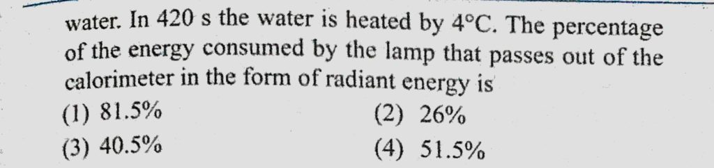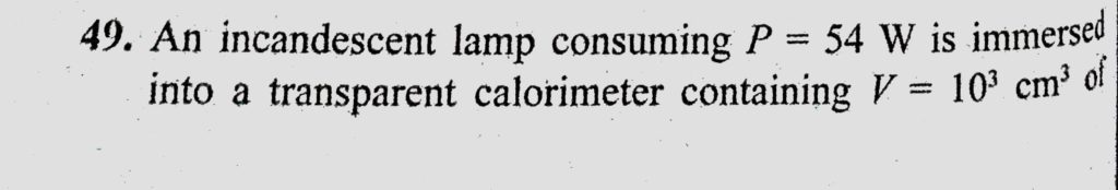 An incandescent lamp consuming P = 54 W is immersed into a transparent calorimeter containing V = 10^3 of water. In 420 s the water is heated by 4 C. The percentage of the energy An incandescent lamp consuming P = 54 W is immersed into a transparent calorimeter containing V = 10^3 of water. In 420 s the water is heated by 4 C. The percentage of the energy October 24, 2020 Category: Uncategorised (JEE Advanced Physics by BM Sharma + GMP Solutions) , Facebook Messenger WhatsApp Share this:TwitterFacebook Related