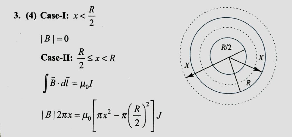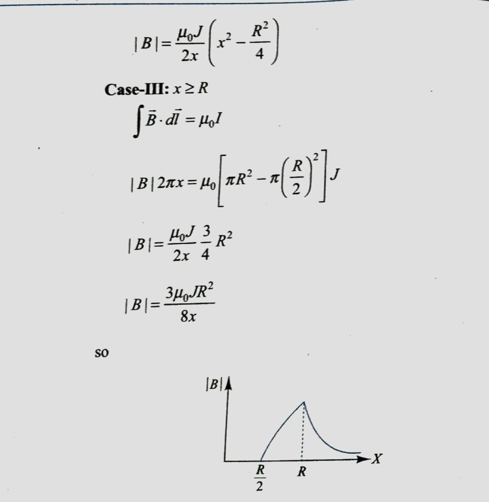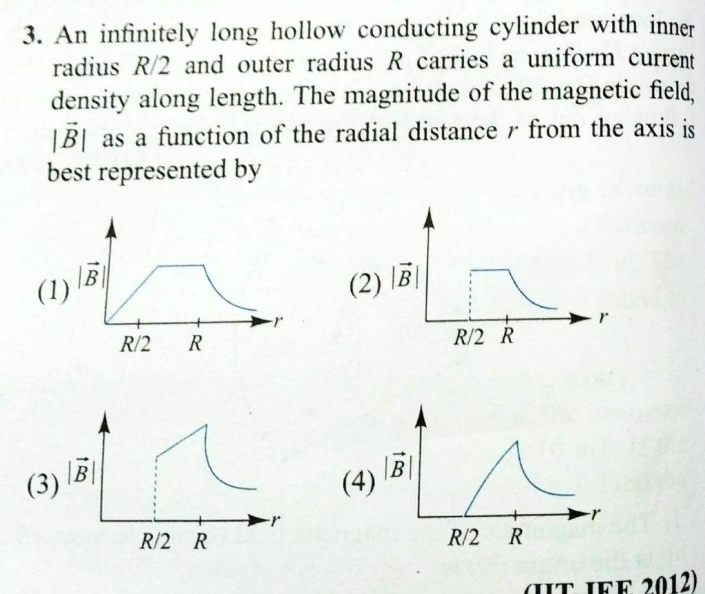 An infinetly long hallow conducting cylinder with inner radius R/2 and outer radius R carries a unjiform current density along length. The magnitude of the magnetic field, B as as a function of th radial distance r from the axis is best represented by