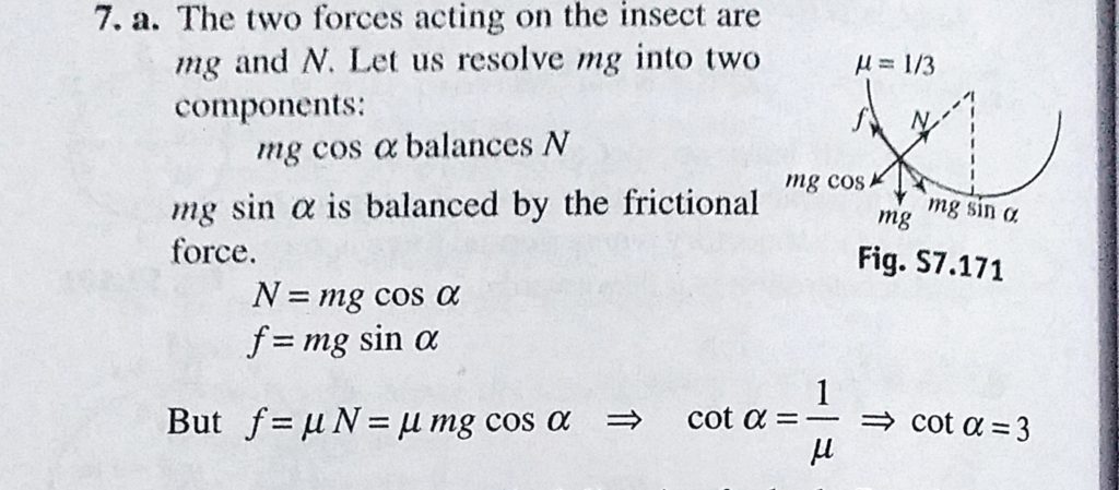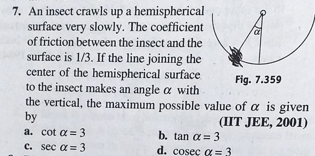 An insect crawls up a hemispherical surface very slowly. The coefficient of friction between the insect and the surface is 1/3. If the line joining the center of the hemispherical surface to the insect A car is moving in a circular horizontal track of radius 10 m with a constant speed of 10 m/s. A plumb bob is suspended form the roof of the car by a light rigid rod. The angle made October 2, 2020 Category: Uncategorised (JEE Advanced Physics by BM Sharma + GMP Solutions) , Facebook Messenger WhatsApp Share this:TwitterFacebook Related