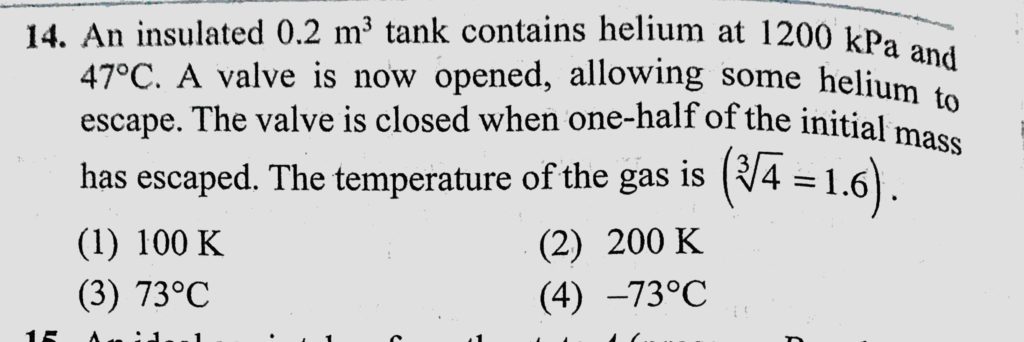 An insulated 0.2 m^3 tank contains helium at 1200 kPa and 47 C. A valve is now opened, allowing some helium to escape. The valve is closed when one-half of the initial mass has allowing some helium to escape. The valve is closed when one-half of the initial mass has An insulated 0.2 m^3 tank contains helium at 1200 kPa and 47 C. A valve is now opened October 29, 2020 Category: Uncategorised (JEE Advanced Physics by BM Sharma + GMP Solutions) , Facebook Messenger WhatsApp Share this:TwitterFacebook Related
