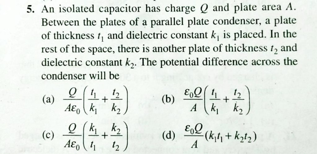 An isolated capactior has charge Q and plate area A. between the plates of a parallel plate condenser, a plate of thickness t1 and dielectric constant k2. The potential difference across the condenser will be a plate of thickness t1 and dielectric constant k2. The potential difference across the condenser will be An isolated capactior has charge Q and plate area A. between the plates of a parallel plate condenser September 18, 2020 Category: Uncategorised (JEE Advanced Physics by BM Sharma + GMP Solutions) , Facebook Messenger WhatsApp Share this:TwitterFacebook Related