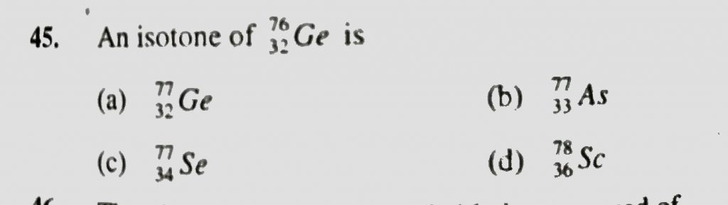 An isotone of 76 32 Ge is (a) 77 32 Ge (b) 77 33 As (c) 77 34 Se (d) 78 36 Sc An isotone of 76 32 Ge is (a) 77 32 Ge (b) 77 33 As (c) 77 34 Se (d) 78 36 Sc November 26, 2020 Category: Uncategorised (JEE Advanced Physics by BM Sharma + GMP Solutions) , Facebook Messenger WhatsApp Share this:TwitterFacebook Related