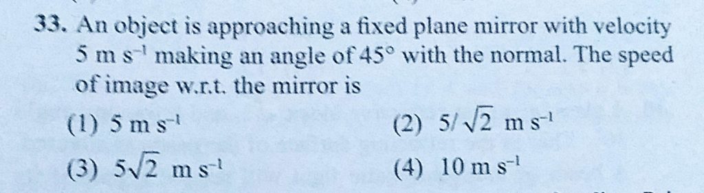An object is approaching a fixed plane mirror with velocity 5 m/s making an angle of 45 with the normal. The speed of image w.r.t. the mirror is An object is approaching a fixed plane mirror with velocity 5 m/s making an angle of 45 with the normal. The speed of image w.r.t. the mirror is October 6, 2020 Category: Uncategorised (JEE Advanced Physics by BM Sharma + GMP Solutions) , Facebook Messenger WhatsApp Share this:TwitterFacebook Related