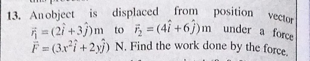 An object is displaced from position vector r1 = (2i + 3j)m to r2 = (4i + 6j)m under a force F = (3x^2i + 2yj) N. Find the work done by the force. An object is displaced from position vector r1 = (2i + 3j)m to r2 = (4i + 6j)m under a force F = (3x^2i + 2yj) N. Find the work done by the force. October 2, 2020 Category: Uncategorised (JEE Advanced Physics by BM Sharma + GMP Solutions) , Facebook Messenger WhatsApp Share this:TwitterFacebook Related