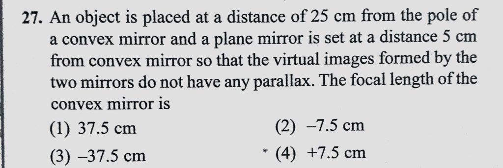 An object is placed at a distance of 25 cm from the pole of a convex mirror and a plane mirror is set at a distance 5 cm from convex mirror so that the virtual images formed by the two mirrors don not An object is placed at a distance of 25 cm from the pole of a convex mirror and a plane mirror is set at a distance 5 cm from convex mirror so that the virtual images formed by the two mirrors don not October 6, 2020 Category: Uncategorised (JEE Advanced Physics by BM Sharma + GMP Solutions) , Facebook Messenger WhatsApp Share this:TwitterFacebook Related