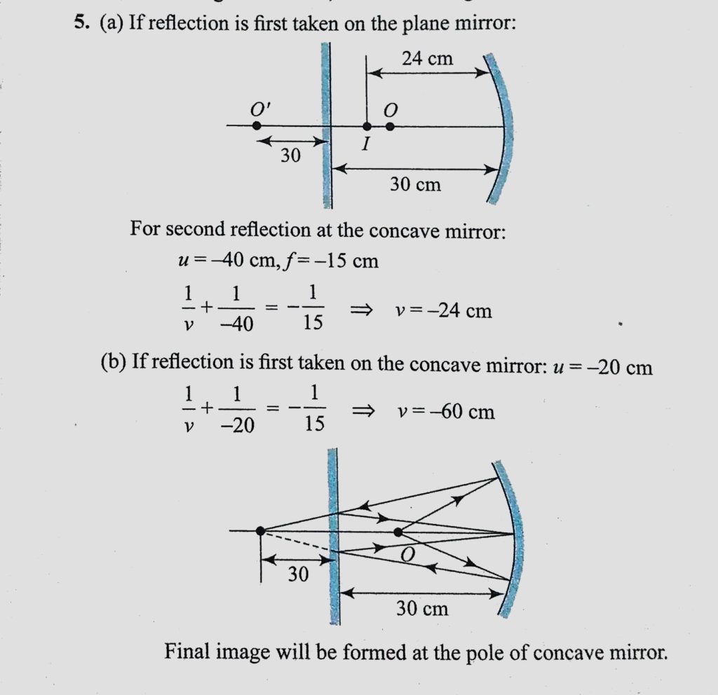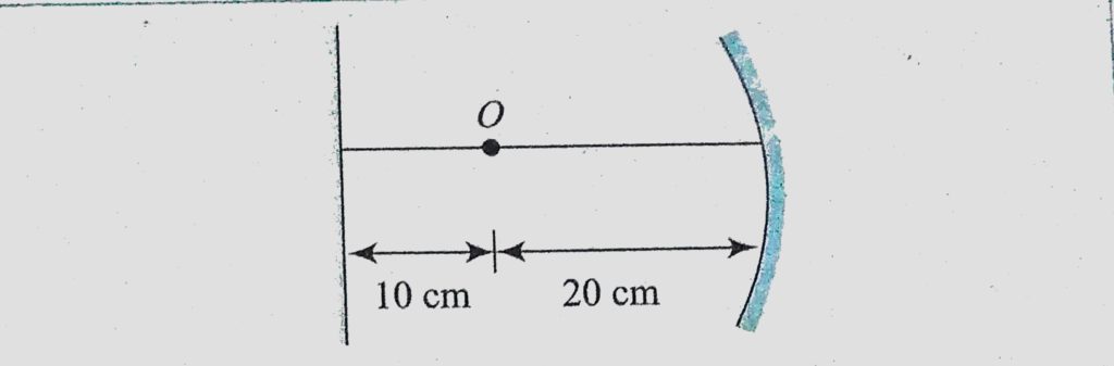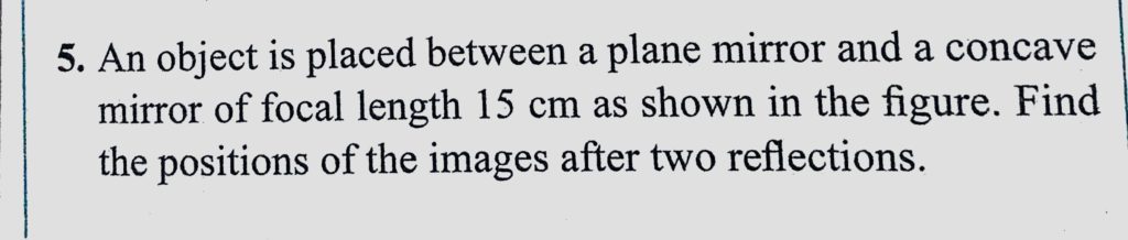 An object is placed between a plane mirror and a concave mirror of focal length 15 cm as shown in the figure. Find the positions of the images after two reflections.An object is placed between a plane mirror and a concave mirror of focal length 15 cm as shown in the figure. Find the positions of the images after two reflections.