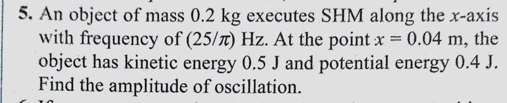 An object of mass 0.2 kg executes SHM along the x-axis with frequency of (25/pie) Hz. At the point x = 0.04 m, the object has kinetic energy 0.5 J and potential energy 0.4 J. An object of mass 0.2 kg executes SHM along the x-axis with frequency of (25/pie) Hz. At the point x = 0.04 m the object has kinetic energy 0.5 J and potential energy 0.4 J. October 30, 2020 Category: Uncategorised (JEE Advanced Physics by BM Sharma + GMP Solutions) , Facebook Messenger WhatsApp Share this:TwitterFacebook Related