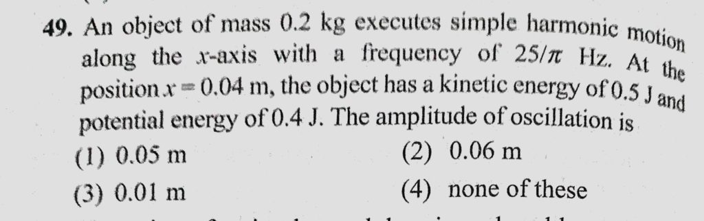 An object of mass 0.2 kg executes simple harmonic motion along the x-axis with a frequency of 25/pie Hz. At the position x = 0.04 m, the object has a kinetic energy of 0.5 J and An object of mass 0.2 kg executes simple harmonic motion along the x-axis with a frequency of 25/pie Hz. At the position x = 0.04 m the object has a kinetic energy of 0.5 J and October 31, 2020 Category: Uncategorised (JEE Advanced Physics by BM Sharma + GMP Solutions) , Facebook Messenger WhatsApp Share this:TwitterFacebook Related