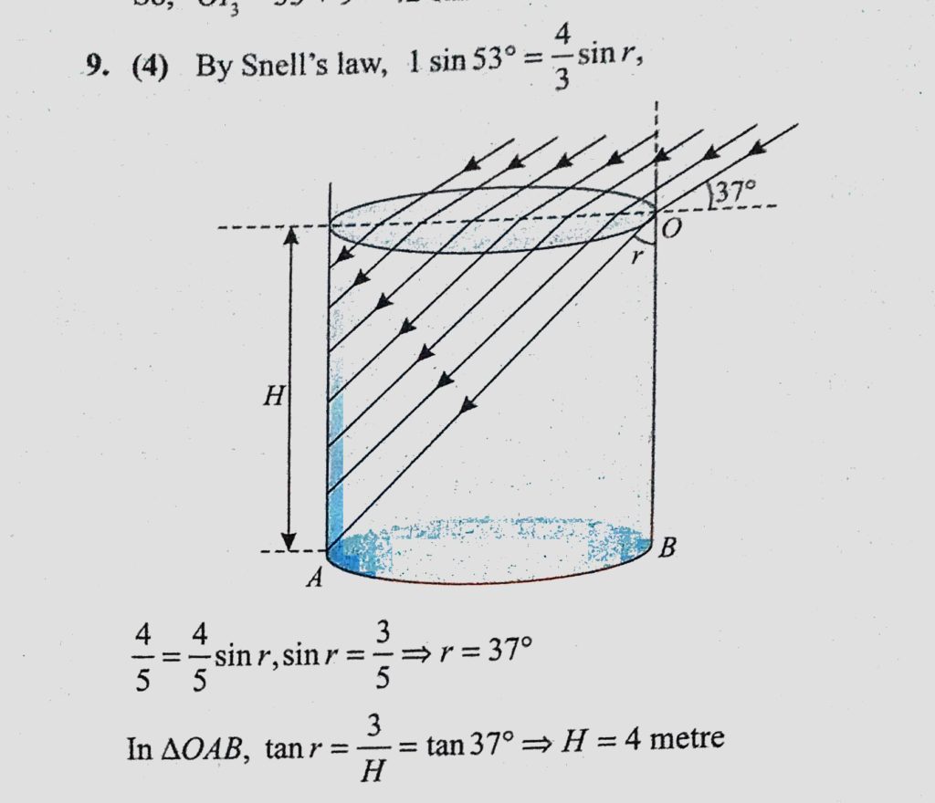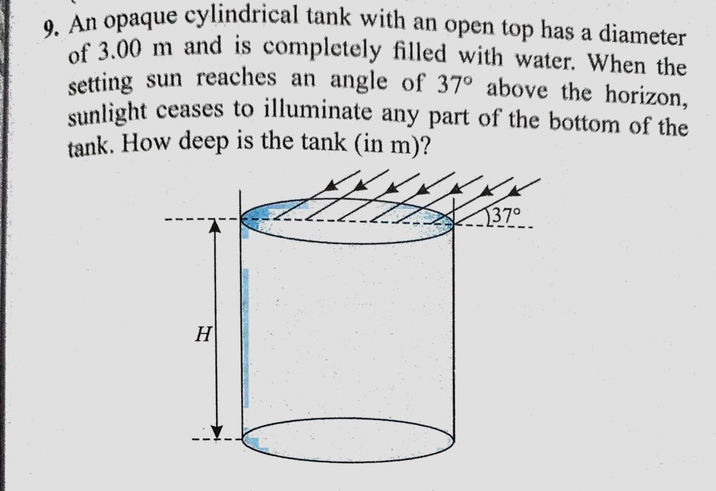 An opaque cylindrical tank with an open has a diameter of 3.00 m and is completely filled with water. When the setting sun reaches an angle of 37 above the horizon, sunlight ceases to illuminate An opaque cylindrical tank with an open has a diameter of 3.00 m and is completely filled with water. When the setting sun reaches an angle of 37 above the horizon sunlight ceases to illuminate October 7, 2020 Category: Uncategorised (JEE Advanced Physics by BM Sharma + GMP Solutions) , Facebook Messenger WhatsApp Share this:TwitterFacebook Related