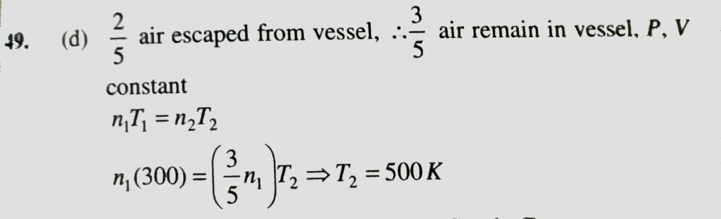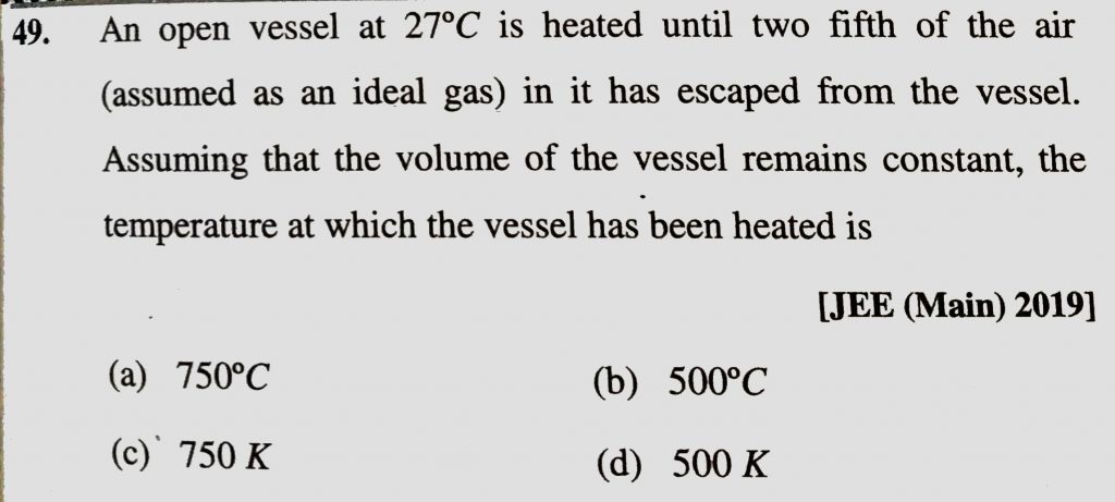 An open vessel at 27 degree C is heated until two fifth of the air (assumed as an ideal gas ) in it has escaped from the vessel. Assuming that the volume of the vessel remains constant , the temperature at which the vessel has been heated is An open vessel at 27 degree C is heated until two fifth of the air (assumed as an ideal gas ) in it has escaped from the vessel. Assuming that the volume of the vessel remains constant the temperature at which the vessel has been heated is February 12, 2021 Category: Uncategorised (JEE Advanced Physics by BM Sharma + GMP Solutions) , Facebook Messenger WhatsApp Share this:TwitterFacebook Related