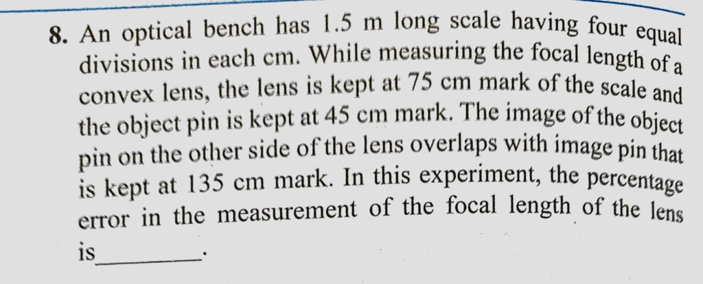 An optical bench has 1.5 m long scale having four equal division in each cm. While measuring the focal length of a convex lens, the lens is kept at 75 cm mark of the scale and the object pin An optical bench has 1.5 m long scale having four equal division in each cm. While measuring the focal length of a convex lens the lens is kept at 75 cm mark of the scale and the object pin October 23, 2020 Category: Uncategorised (JEE Advanced Physics by BM Sharma + GMP Solutions) , Facebook Messenger WhatsApp Share this:TwitterFacebook Related