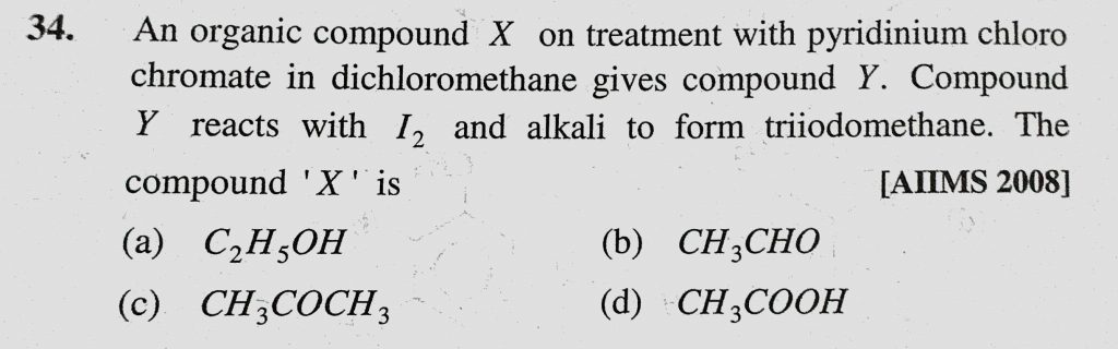 An organic compound X on treatment with pyridinium chloro chromate in dichloromethane gives compound Y. Compound Y reacts with I2 and alkali to form triiodomethane. The compound ‘X’ is An organic compound X on treatment with pyridinium chloro chromate in dichloromethane gives compound Y. Compound Y reacts with I2 and alkali to form triiodomethane. The compound 'X' is February 10, 2021 Category: Uncategorised (JEE Advanced Physics by BM Sharma + GMP Solutions) , Facebook Messenger WhatsApp Share this:TwitterFacebook Related