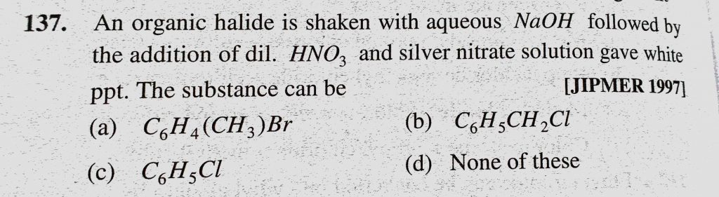 An organic halide is shaken with aqueous NaOH followed by the addition of dil. HNO3 and silver nitrate solution gave white ppt. The substance can be Reaction of alkyl halides with aromatic compounds in presence of anhydrous AlCl3 is known as (a) Friedal-Craft reaction (b) Hofmann degradation (c) Kolbe's synthesis February 8, 2021 Category: Uncategorised (JEE Advanced Physics by BM Sharma + GMP Solutions) , Facebook Messenger WhatsApp Share this:TwitterFacebook Related