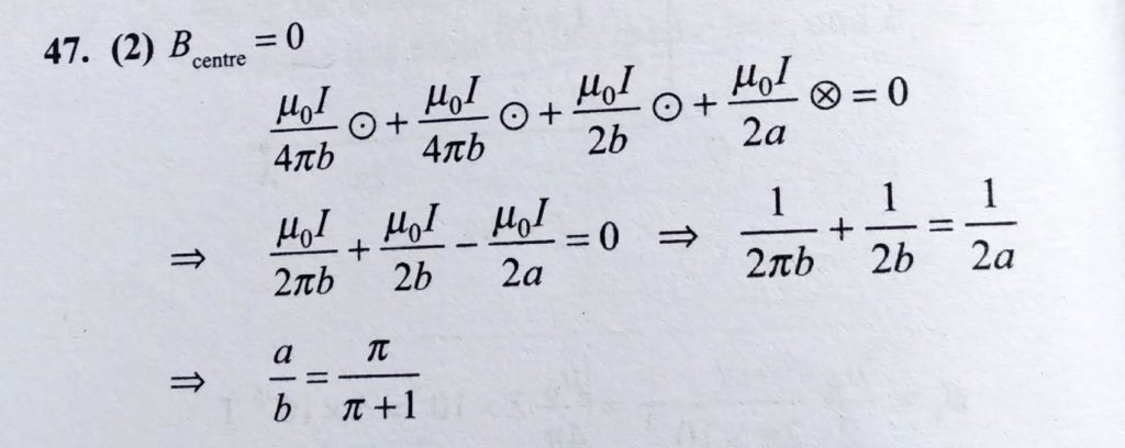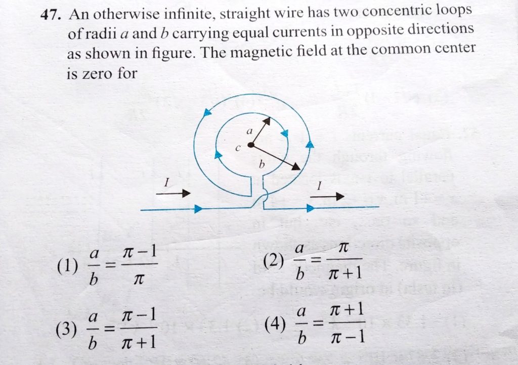 An otherwise infinte, straight wire has two concentric loops of radii a and b carrying equal currents in opposite directions as shown in figure. The magnetic field at the common centre is zero for An otherwise infinte straight wire has two concentric loops of radii a and b carrying equal currents in opposite directions as shown in figure. The magnetic field at the common centre is zero for October 17, 2020 Category: Uncategorised (JEE Advanced Physics by BM Sharma + GMP Solutions) , Facebook Messenger WhatsApp Share this:TwitterFacebook Related