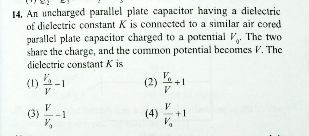 An uncharged parallel plate capacitor having dielectric of constant K is connected to a similar air cored parallel capacitor charged to a potential V. The two share the charge and the common potential is V’. The dielectric constant K is. the charge on capacitor C1 is Three capacitors are connected as shown in figure. Then November 7, 2020 Category: Uncategorised (JEE Advanced Physics by BM Sharma + GMP Solutions) , Facebook Messenger WhatsApp Share this:TwitterFacebook Related