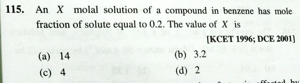 An X molal solution of a compound in benzene has mole fraction of solute equal to 0.2 . THe value of X is An X molal solution of a compound in benzene has mole fraction of solute equal to 0.2 . THe value of X is December 11, 2020 Category: Uncategorised (JEE Advanced Physics by BM Sharma + GMP Solutions) , Facebook Messenger WhatsApp Share this:TwitterFacebook Related