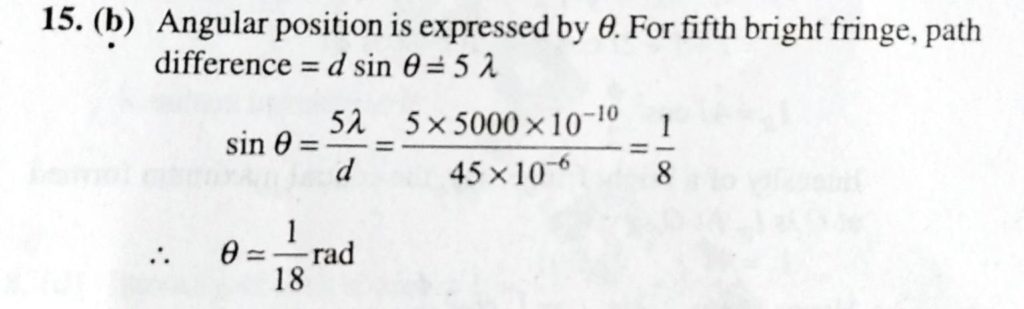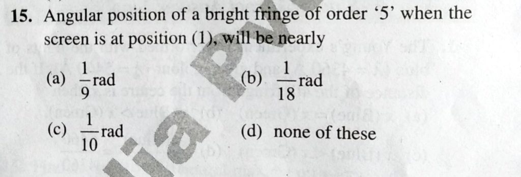 Angular position of a bright fringe of order ‘5’ when the screen is at position (1), will be nearly Angular position of a bright fringe of order '5' when the screen is at position (1) will be nearly September 13, 2020 Category: Uncategorised (JEE Advanced Physics by BM Sharma + GMP Solutions) , Facebook Messenger WhatsApp Share this:TwitterFacebook Related