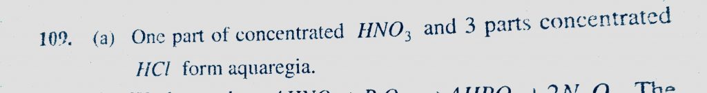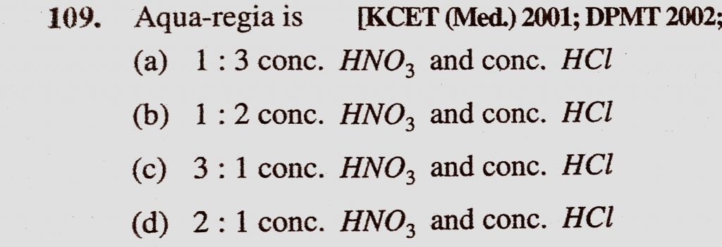 Aqua-regia is (a) 1 : 3 conc. HNO3 and conc. HCl (b) 1 : 2 conc. HNO3 and conc. HCl (c) 3 : 1 conc. HNO3 and conc. HCl Aqua-regia is (a) 1 : 3 conc. HNO3 and conc. HCl (b) 1 : 2 conc. HNO3 and conc. HCl (c) 3 : 1 conc. HNO3 and conc. HCl November 22, 2020 Category: Uncategorised (JEE Advanced Physics by BM Sharma + GMP Solutions) , Facebook Messenger WhatsApp Share this:TwitterFacebook Related