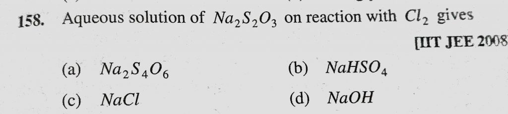 Aqueous solution of Na2S2O3 on reaction with Cl2 gives (a) Na2S4O6 (b) NaHSO4 (c) NaCl (d) NaOH Aqueous solution of Na2S2O3 on reaction with Cl2 gives (a) Na2S4O6 (b) NaHSO4 (c) NaCl (d) NaOH November 28, 2020 Category: Uncategorised (JEE Advanced Physics by BM Sharma + GMP Solutions) , Facebook Messenger WhatsApp Share this:TwitterFacebook Related