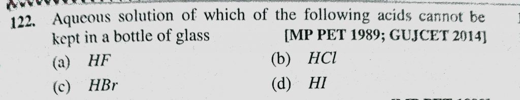 Aqueous solution of which of the following acids cannot be kept in a bottle of glass (a) HF (b) HCl (c) HBr (d) HI Aqueous solution of which of the following acids cannot be kept in a bottle of glass (a) HF (b) HCl (c) HBr (d) HI November 24, 2020 Category: Uncategorised (JEE Advanced Physics by BM Sharma + GMP Solutions) , Facebook Messenger WhatsApp Share this:TwitterFacebook Related