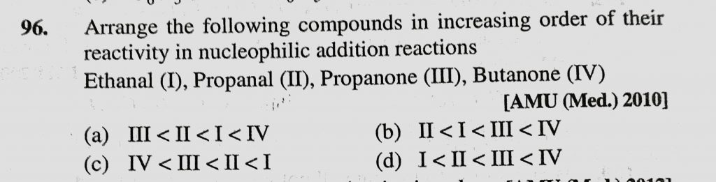 Arrange the following compounds in increasing order of their reactivity in nucleophilic addition reactions Ethanal (I) , Propanal (II) , Propanone (III), Butanone (IV) Arrange the following compounds in increasing order of their reactivity in nucleophilic addition reactions Ethanal (I) Butanone (IV) Propanal (II) Propanone (III) February 12, 2021 Category: Uncategorised (JEE Advanced Physics by BM Sharma + GMP Solutions) , Facebook Messenger WhatsApp Share this:TwitterFacebook Related