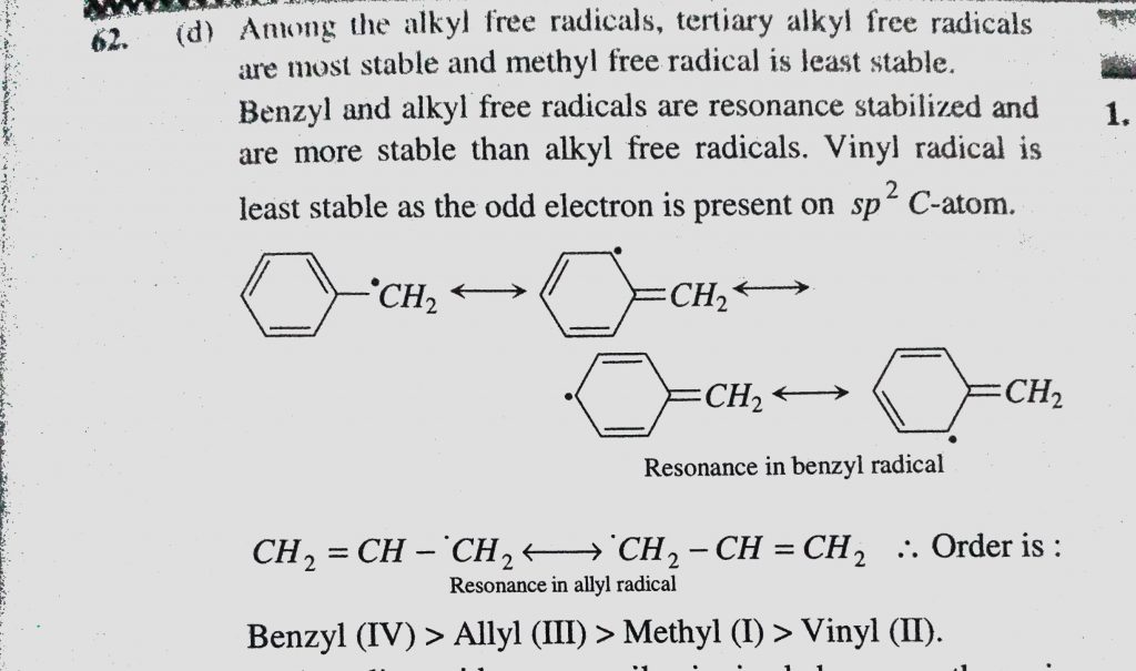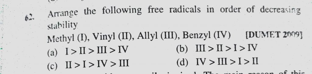 Arrange the following free radicals in order of decreasing stability Methyl (I), Vinyl (II), Allyl (III), Benzyl (IV) Allyl (III) Arrange the following free radicals in order of decreasing stability Methyl (I) Benzyl (IV) Vinyl (II) December 9, 2020 Category: Uncategorised (JEE Advanced Physics by BM Sharma + GMP Solutions) , Facebook Messenger WhatsApp Share this:TwitterFacebook Related
