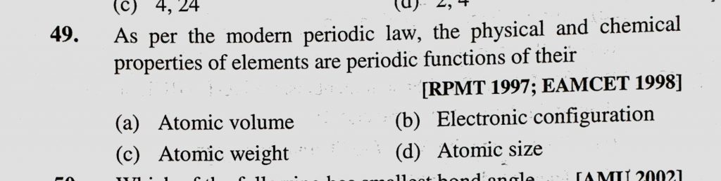 As per the modern periodic law, the physical and chemical properties of elements are periodic function of their As per the modern periodic law the physical and chemical properties of elements are periodic function of their November 8, 2020 Category: Uncategorised (JEE Advanced Physics by BM Sharma + GMP Solutions) , Facebook Messenger WhatsApp Share this:TwitterFacebook Related