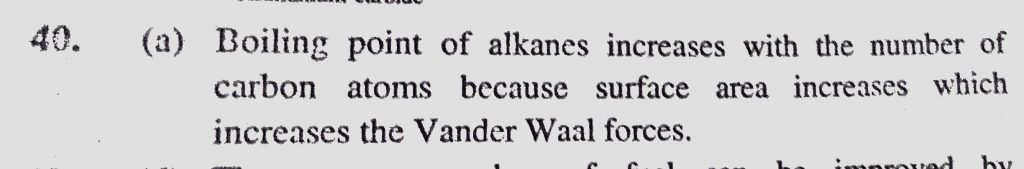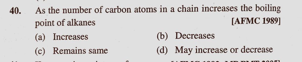 As the number of carbon atoms in a chain increases the boiling point of alkanes (a) Increases (b) Decreases (c) Remains same As the number of carbon atoms in a chain increases the boiling point of alkanes (a) Increases (b) Decreases (c) Remains same December 12, 2020 Category: Uncategorised (JEE Advanced Physics by BM Sharma + GMP Solutions) , Facebook Messenger WhatsApp Share this:TwitterFacebook Related