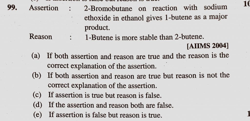 Assertion : 2-Bromobutane on reaction with sodium ethoxide in ethanol gives 1-butene as a major product Reason : 1-Butene is more stable than 2-butene. Assertion : 2-Bromobutane on reaction with sodium ethoxide in ethanol gives 1-butene as a major product Reason : 1-Butene is more stable than 2-butene. December 14, 2020 Category: Uncategorised (JEE Advanced Physics by BM Sharma + GMP Solutions) , Facebook Messenger WhatsApp Share this:TwitterFacebook Related