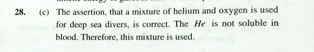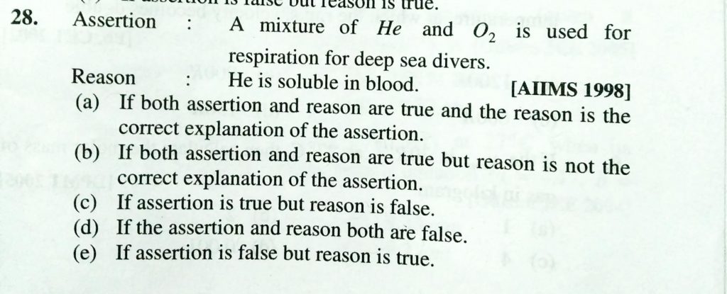 Assertion : A mixture of He and O2 is used for respiration for deep sea divers. Reason : He is soluble in blood. Assertion : A mixture of He and O2 is used for respiration for deep sea divers. Reason : He is soluble in blood. February 11, 2021 Category: Uncategorised (JEE Advanced Physics by BM Sharma + GMP Solutions) , Facebook Messenger WhatsApp Share this:TwitterFacebook Related