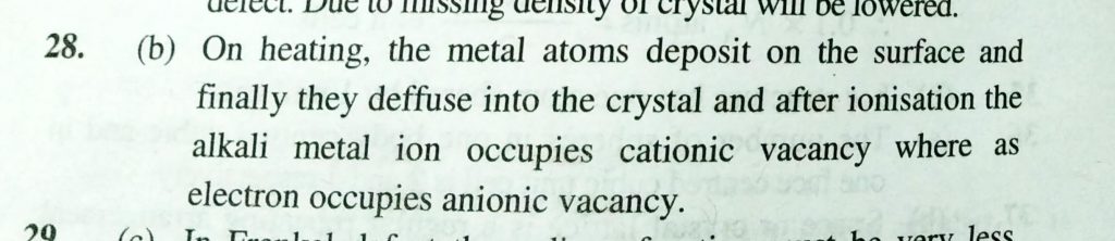 Assertion: Anion vacancies in alkali halides are produced by heating the alkali halide crystals with alkali metal vapour. Reason: Electrons trapped in anion vacancies are referred to as F -centres. Assertion: Anion vacancies in alkali halides are produced by heating the alkali halide crystals with alkali metal vapour. Reason: Electrons trapped in anion vacancies are referred to as F -centres. December 17, 2020 Category: Uncategorised (JEE Advanced Physics by BM Sharma + GMP Solutions) , Facebook Messenger WhatsApp Share this:TwitterFacebook Related