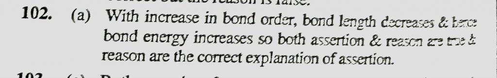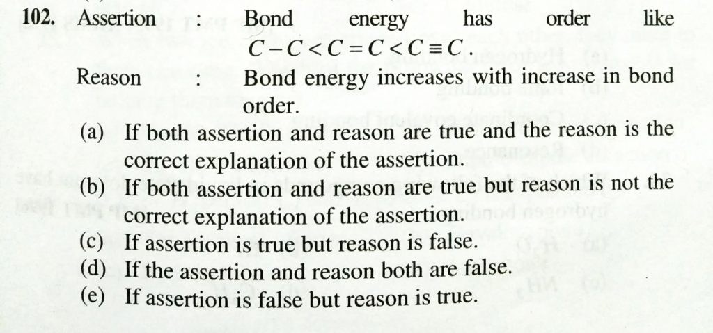Assertion : Bond energy has order like C – C < C = C < C — C. Reason : Bond energy increases with increase in bond order. Assertion : Bond energy has order like C - C < C = C < C --- C. Reason : Bond energy increases with increase in bond order. December 8, 2020 Category: Uncategorised (JEE Advanced Physics by BM Sharma + GMP Solutions) , Facebook Messenger WhatsApp Share this:TwitterFacebook Related