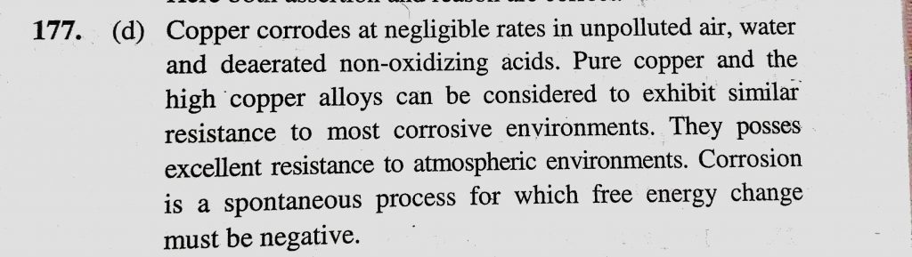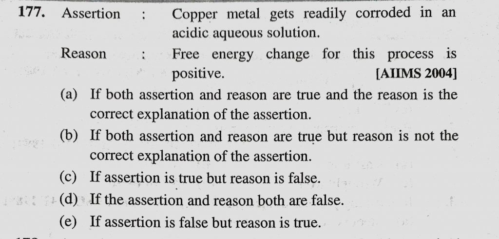 Assertion : Copper metal gets readily corroded in an acidic aqueous solution. Reason : Free energy change for this process is positive. Assertion : Copper metal gets readily corroded in an acidic aqueous solution. Reason : Free energy change for this process is positive. November 30, 2020 Category: Uncategorised (JEE Advanced Physics by BM Sharma + GMP Solutions) , Facebook Messenger WhatsApp Share this:TwitterFacebook Related