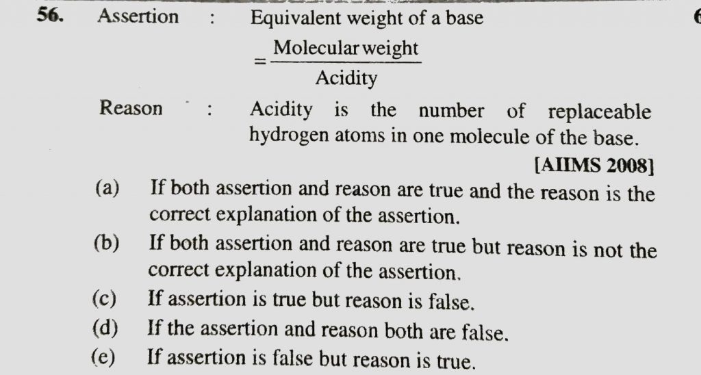 Assertion : Equivalent weight of a base = Molecular weight /Acidity Reason : Acidity is the number of replaceable hydrogen atoms in one molecule of the base. Assertion : Equivalent weight of a base = Molecular weight /Acidity Reason : Acidity is the number of replaceable hydrogen atoms in one molecule of the base. November 22, 2020 Category: Uncategorised (JEE Advanced Physics by BM Sharma + GMP Solutions) , Facebook Messenger WhatsApp Share this:TwitterFacebook Related