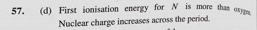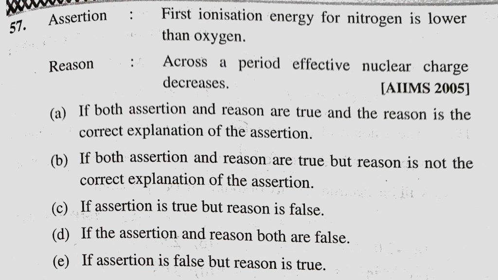 Assertion : First ionisation energy for nitrogen is lower than oxygen . Reason : Across a period effective nuclear charge decreases. Assertion : First ionisation energy for nitrogen is lower than oxygen . Reason : Across a period effective nuclear charge decreases. November 9, 2020 Category: Uncategorised (JEE Advanced Physics by BM Sharma + GMP Solutions) , Facebook Messenger WhatsApp Share this:TwitterFacebook Related