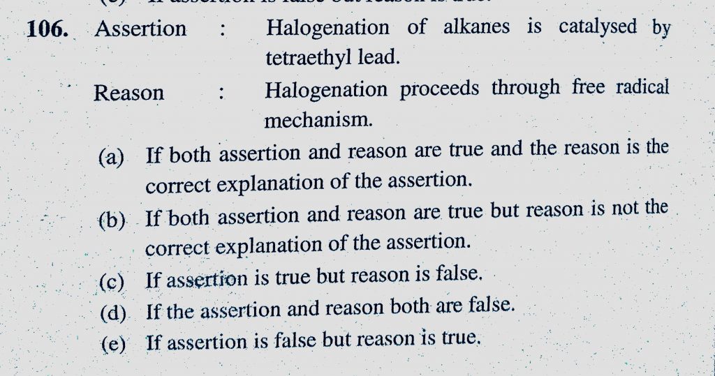 Assertion : Halogenation of alkanes is catalysed by tetraethyl lead. Reason : Halogenation proceeds through free radical mechanism. Assertion : Halogenation of alkanes is catalysed by tetraethyl lead. Reason : Halogenation proceeds through free radical mechanism. December 14, 2020 Category: Uncategorised (JEE Advanced Physics by BM Sharma + GMP Solutions) , Facebook Messenger WhatsApp Share this:TwitterFacebook Related