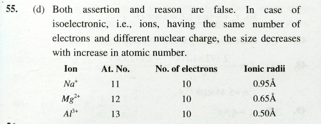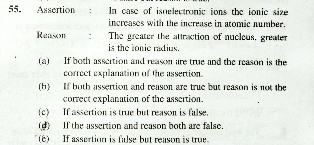 Assertion : In case of isoelectronic ions the ionic size increases with the increase in atomic number. Reason : The greater the attraction of nucleus, greater is the ionic radius. Assertion : In case of isoelectronic ions the ionic size increases with the increase in atomic number. Reason : The greater the attraction of nucleus greater is the ionic radius. November 26, 2020 Category: Uncategorised (JEE Advanced Physics by BM Sharma + GMP Solutions) , Facebook Messenger WhatsApp Share this:TwitterFacebook Related