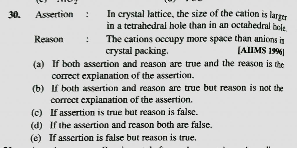 Assertion : In crystal lattice, the size of the cation is larger in a tetrahedral hole than in an Octahedral hole. Reason : The cations occupy more space than anions in crystal packing. Assertion : In crystal lattice the size of the cation is larger in a tetrahedral hole than in an Octahedral hole. Reason : The cations occupy more space than anions in crystal packing. December 17, 2020 Category: Uncategorised (JEE Advanced Physics by BM Sharma + GMP Solutions) , Facebook Messenger WhatsApp Share this:TwitterFacebook Related