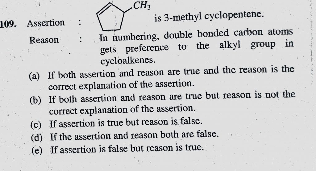 Assertion : is 3-methyl cyclopentene. Reason : In numbering , double bonded carbon atoms gets preference to the alkyl group in cycloalkenes. Assertion : is 3-methyl cyclopentene. Reason : In numbering double bonded carbon atoms gets preference to the alkyl group in cycloalkenes. December 11, 2020 Category: Uncategorised (JEE Advanced Physics by BM Sharma + GMP Solutions) , Facebook Messenger WhatsApp Share this:TwitterFacebook Related