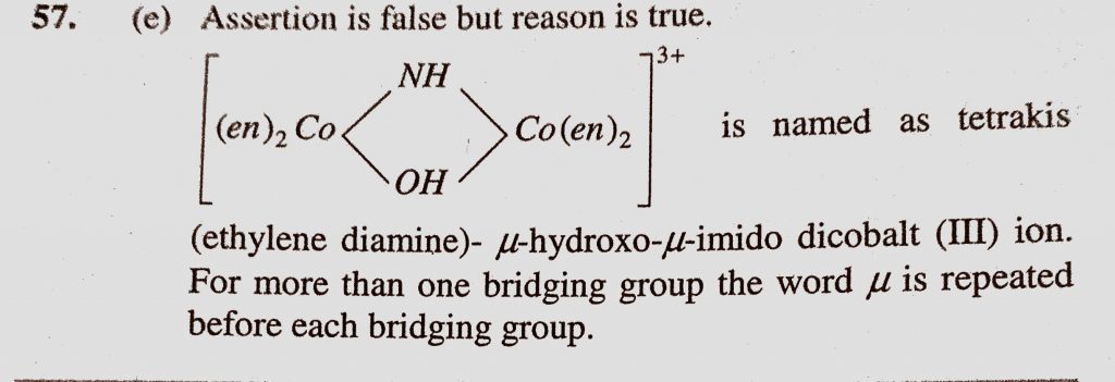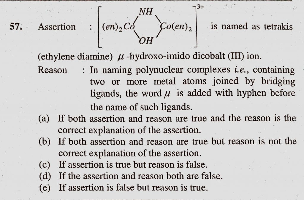 Assertion : is named as tetrakis ( ethylene diamine ) μ- hydroxo – imido dicobalt (III) ion. Reason : In naming polynuclear complexes i.e., containing two or more metal atoms joined by bridging ligands, the word μ is add with hyphen before the name of such ligands.