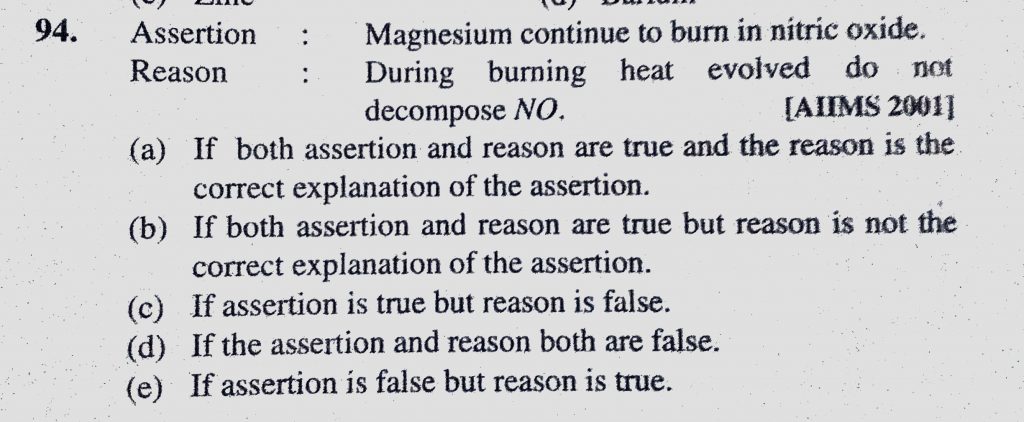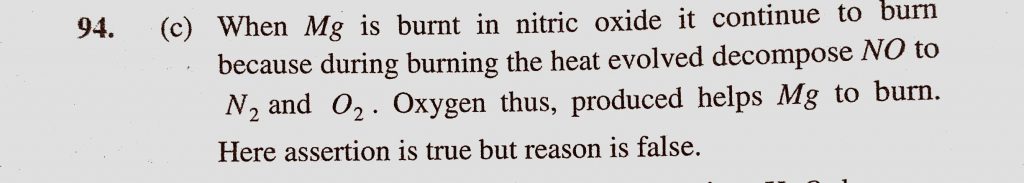 Assertion : Magnesium continue to burn in nitric oxide. Reason : During burning heat evolved do not decompose NO. Assertion : Magnesium continue to burn in nitric oxide. Reason : During burning heat evolved do not decompose NO. November 17, 2020 Category: Uncategorised (JEE Advanced Physics by BM Sharma + GMP Solutions) , Facebook Messenger WhatsApp Share this:TwitterFacebook Related