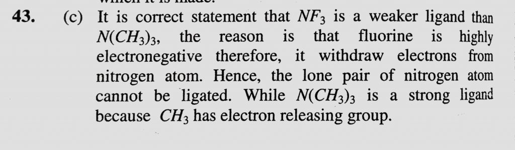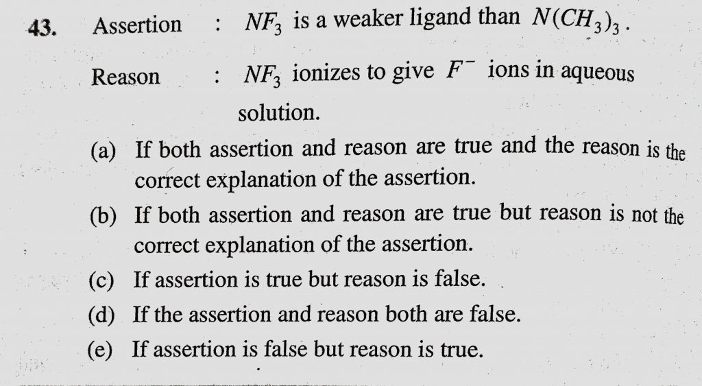 Assertion : NF3 is a weaker ligand than N(CH3)3. Reason : NF3 ionizes to give F- ions in aqueous solution Assertion : NF3 is a weaker ligand than N(CH3)3. Reason : NF3 ionizes to give F- ions in aqueous solution December 3, 2020 Category: Uncategorised (JEE Advanced Physics by BM Sharma + GMP Solutions) , Facebook Messenger WhatsApp Share this:TwitterFacebook Related