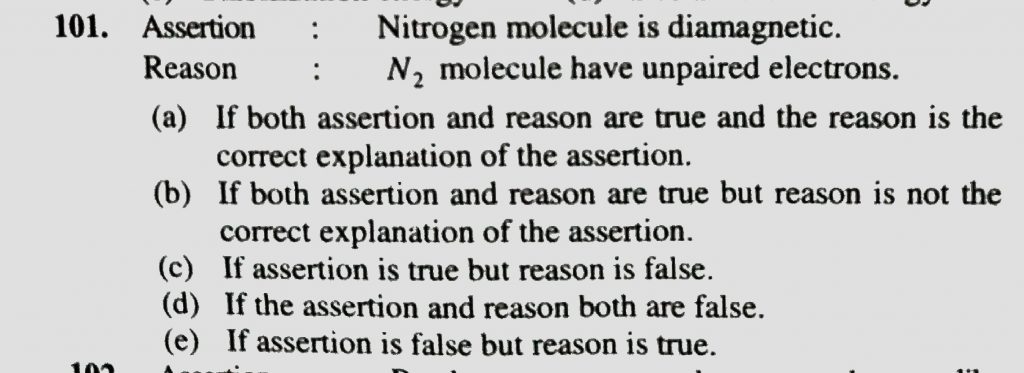 Assertion : Nitrogen molecule is diamagnetic . Reason : N2 molecule have unpaired electrons. Assertion : Nitrogen molecule is diamagnetic . Reason : N2 molecule have unpaired electrons. December 8, 2020 Category: Uncategorised (JEE Advanced Physics by BM Sharma + GMP Solutions) , Facebook Messenger WhatsApp Share this:TwitterFacebook Related