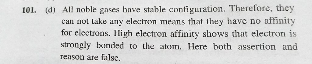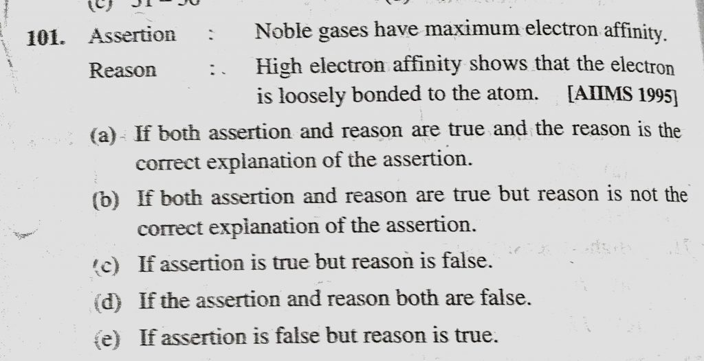 Assertion : Noble gases have maximum electron affinity. Reason : High electron affinity shows that the electron is loosely bonded to the atom. Assertion : Noble gases have maximum electron affinity. Reason : High electron affinity shows that the electron is loosely bonded to the atom. November 9, 2020 Category: Uncategorised (JEE Advanced Physics by BM Sharma + GMP Solutions) , Facebook Messenger WhatsApp Share this:TwitterFacebook Related