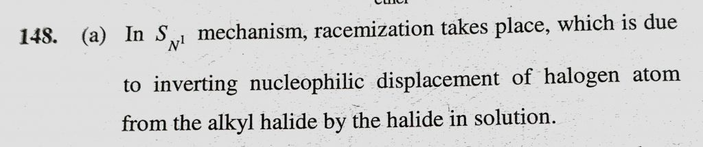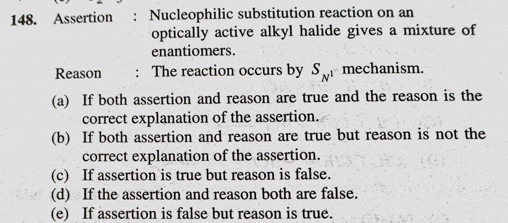 Assertion : Nucleophilic substitution reaction on an optically active alkyl halide gives a mixture of enantiomers . Reason : The reaction occours by S N1 mechanism. (a) If both assertion and reason are true and the reason is the correct explanation of the assertion.