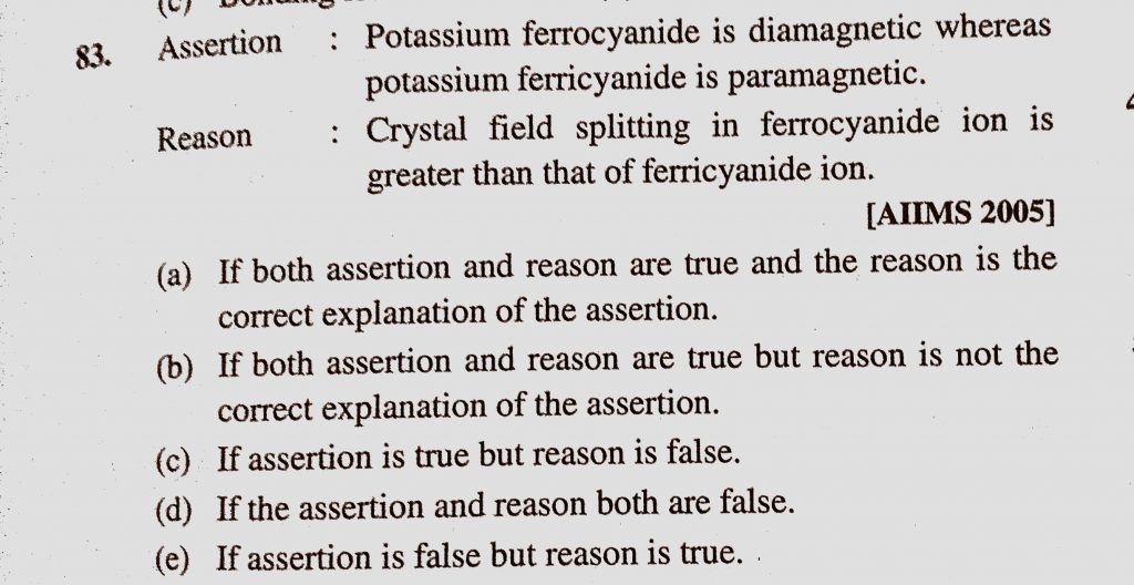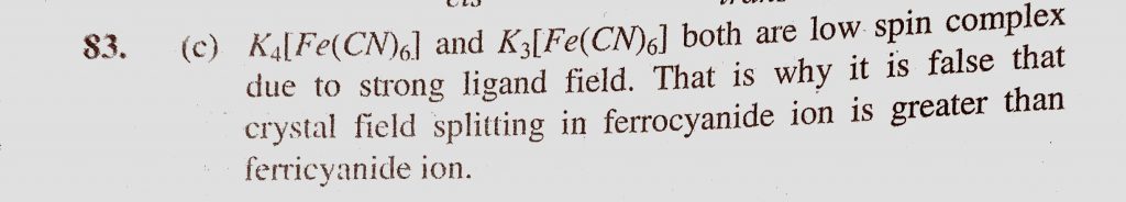 Assertion : Potassium ferrocyanide is diamagnetic whereas potassium ferricyanide is paramagnetic. Reason : Crystal field splitting in ferrocyanide ion is greater than that of ferricyanide ion. Assertion : Potassium ferrocyanide is diamagnetic whereas potassium ferricyanide is paramagnetic. Reason : Crystal field splitting in ferrocyanide ion is greater than that of ferricyanide ion. December 4, 2020 Category: Uncategorised (JEE Advanced Physics by BM Sharma + GMP Solutions) , Facebook Messenger WhatsApp Share this:TwitterFacebook Related